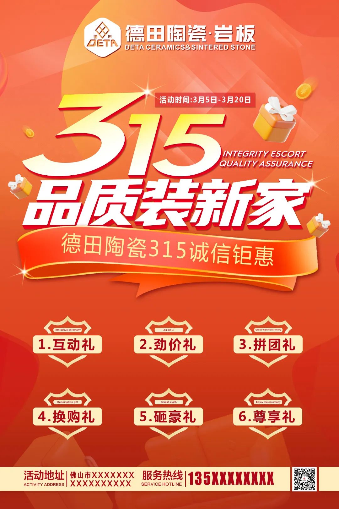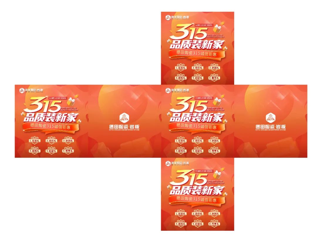 為了更好地配合各地經銷商開展3·15促銷活動,助力終端店面營造濃郁的活動促銷氛圍、抓住開春時機,搶占市場,贏得門店銷售開門紅,德田陶瓷推出系列促銷方案及設計了3·15氛圍相關物料(含拱門、單張、展架、貼紙等整套源文件)供各位經銷商朋友使用。請各經銷商家人們咨詢所屬區域經理領取,并在當地進行制作。(方案內容僅供參考,經銷商可根據自身實際需要作出調整)