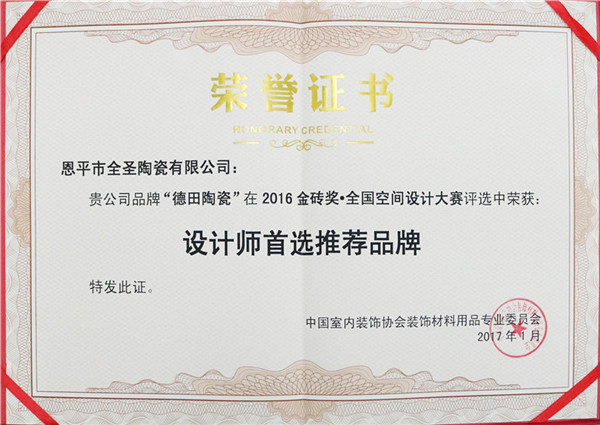 德田陶瓷以“勇于創新、高品質、高性價比”為品牌經營理念,為不同需求的客戶,提供最適合的陶瓷產品和配套服務,深耕多年,憑匠心品質、優質服務得到了政府、行業及消費者的認可,更獲得行業認可的多項榮譽。20多年的品牌穩健發展,更是得到了萬科、恒大、保利、碧桂園、喜來登、香格里拉等多家知名企業的認可,幾百個標桿工程項目佇立中國大江南北。